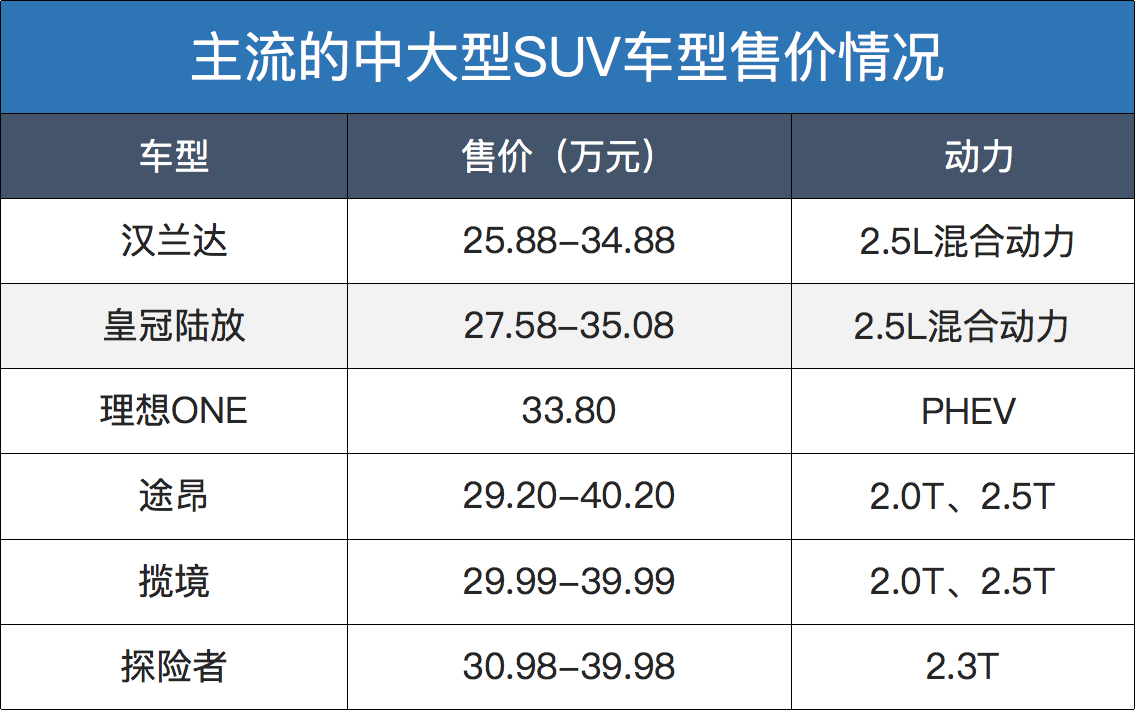 在30万价位中,可以看到汉兰达是最大竞争对手。TNGA架构赋能,再加上2.5L混合动力加持,产品全面革新的汉兰达在竞争力上依然不减当年。并且与现款汉兰达同款销售,进一步拔高市场定位。
