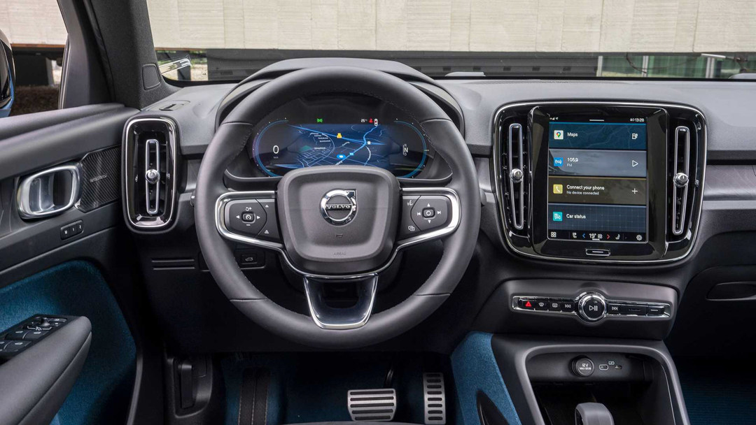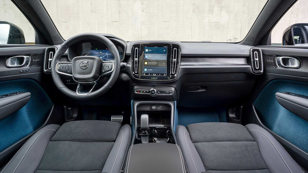 内饰同样如此,首先能明显看出C40 Recharge的中控台布局与XC40是几乎一致的,其中三幅式的多功能方向盘、12.3英寸液晶仪表盘、9英寸中控屏等配置均得到了延续,看起来很精致。不同的是,C40 Recharge采用了独特的Fjord Blue配色,其中蓝色的地毯是使用了旧渔网再生打造而来,整体更加环保,很符合纯电动车型的定位。