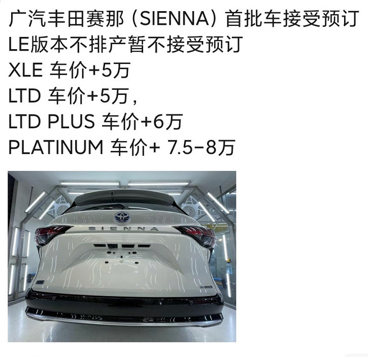 就比如,近段时间很火的中大型MPV——丰田赛那,有网友爆料称,某销售的朋友圈发表了一则关于丰田赛那的加价消息。最低配的直接先就不排产暂时不接受预定,其余的版本则加5-8万元左右。