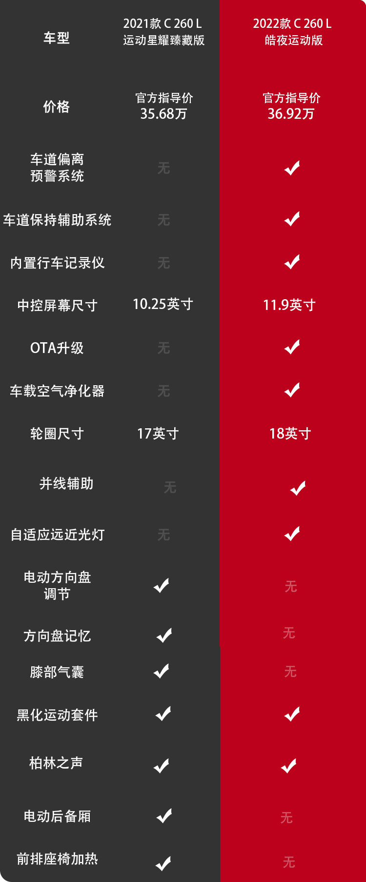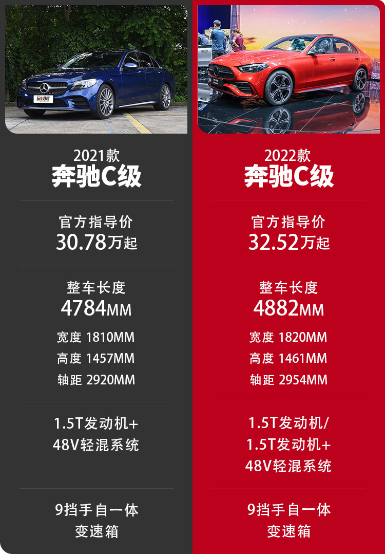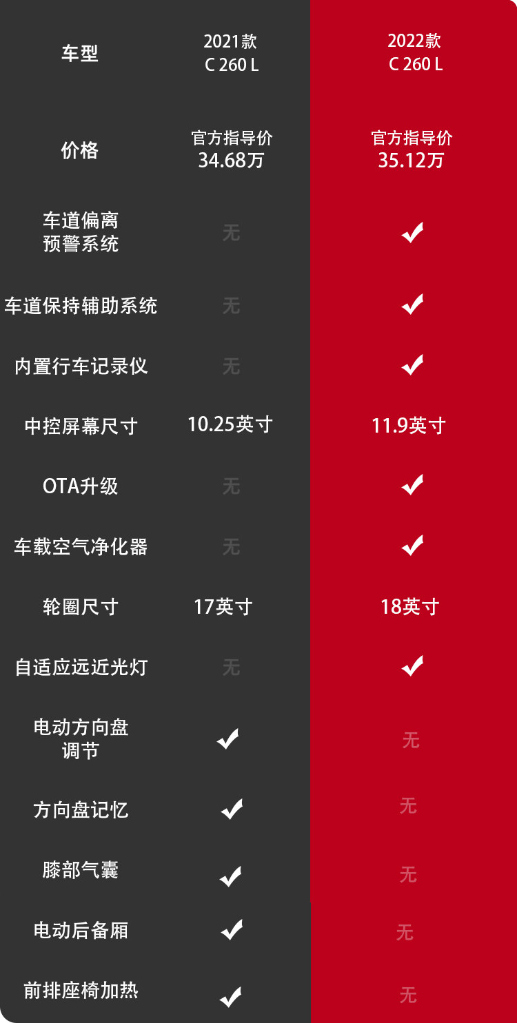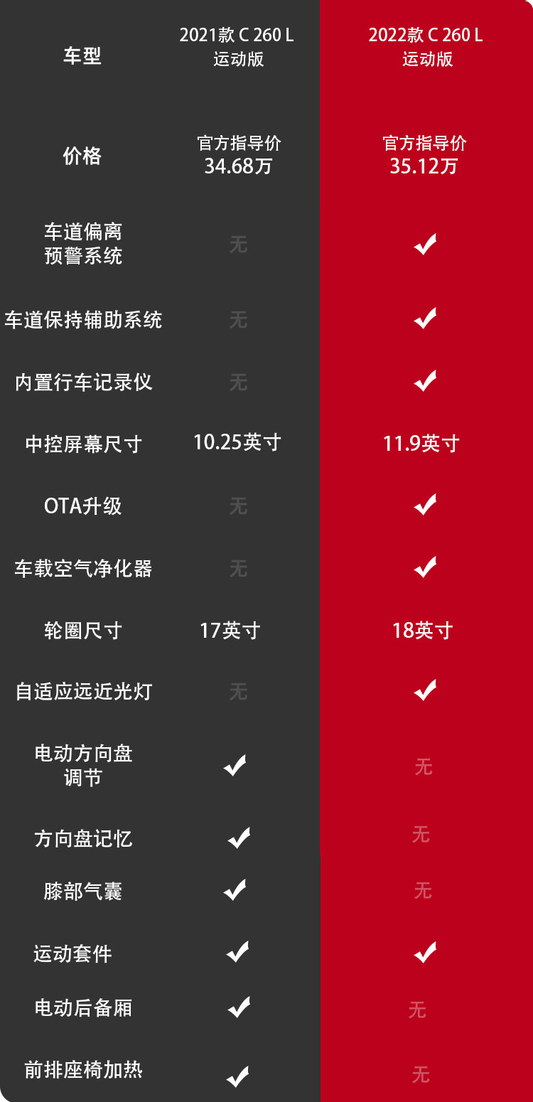 2021款 C 260 L(34.68万)和2022款 C 260 L(35.12万)虽然两者均为相同版本,但搭载的动力系统就稍微有区别,主要差异在主动安全与科技配置上。