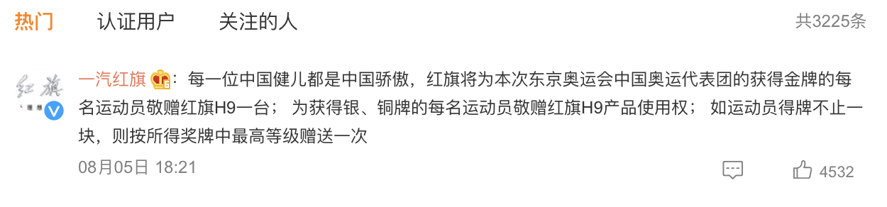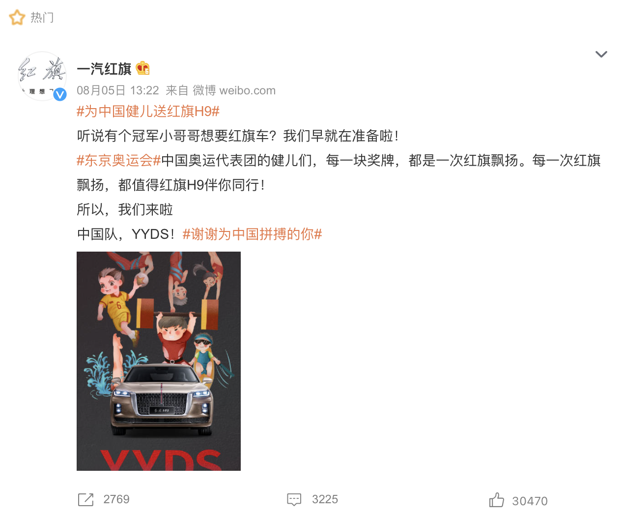 还记得8月份一汽红旗汽车一度霸占微博热搜的事情吗?是的,当时一汽红旗汽车承诺将为东京奥运会中国奥运代表团获得金牌的每一位运动员赠予一台红旗H9,银、铜牌则赠予红旗H9产品使用权!
