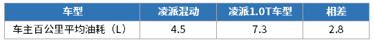 根据车主反馈,凌派1.0T车型的百公里平均油耗为7.3L,而混动车型的百公里平均油耗为4.5L,后者百公里油耗比前者节省2.8L。
