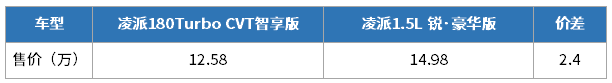 配置比较接近的“180Turbo CVT智享版”和“1.5L 锐·豪华版 ”,售价分别为12.58万和14.98万,前者比后者贵了2.4万元。