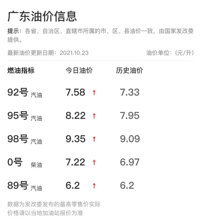 随着全球能源危机加剧,国际油价持续走高,多国汽油价格也随之上涨。而咱们国家在10月22日,新一轮成品油调价窗口也已开启,国家发改委信息显示,汽油每吨上调300元,柴油每吨上调290元,经历本轮大涨后,95号汽油在广州已经8.22元/升;92号汽油也超过7.5元/升;而0号柴油,直接进入7元时代。