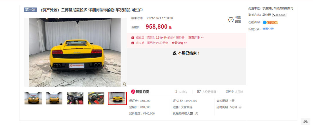 也就是说,在周先生出价后,再也没有人继续出价,目前情况来看就是周先生需要买下这辆价格为95.88万的兰博基尼盖拉多。