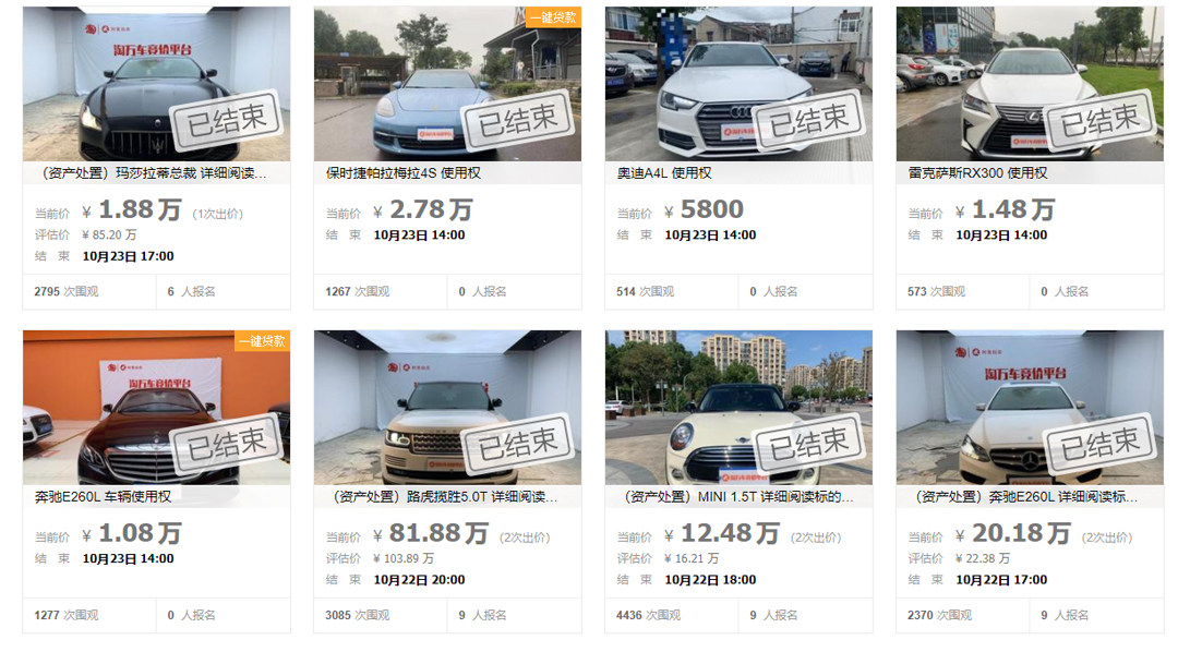 通过搜索这间车行可以发现,该车辆的确有不少豪车在拍卖,拍卖价基本都在1-2万元之间,而拍卖的商品部分是车辆使用权,部分是车辆整车,但大部分都是流拍,成功案例不多。