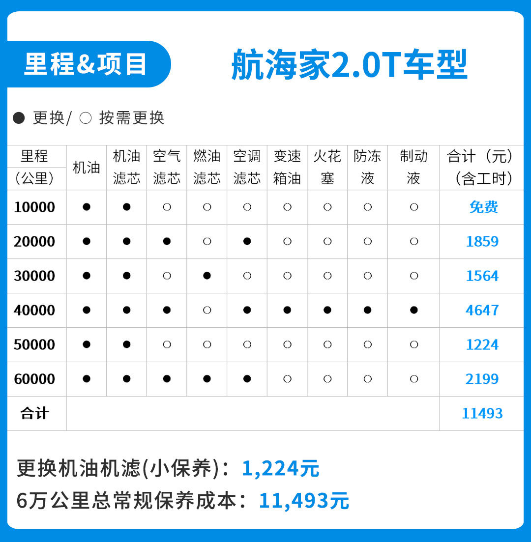 根据厂家建议,航海家的保养周期为1万公里,其中首保免费,更换机油机滤的小保养费用为1,224元,4万公里大保养的费用为4,647元。