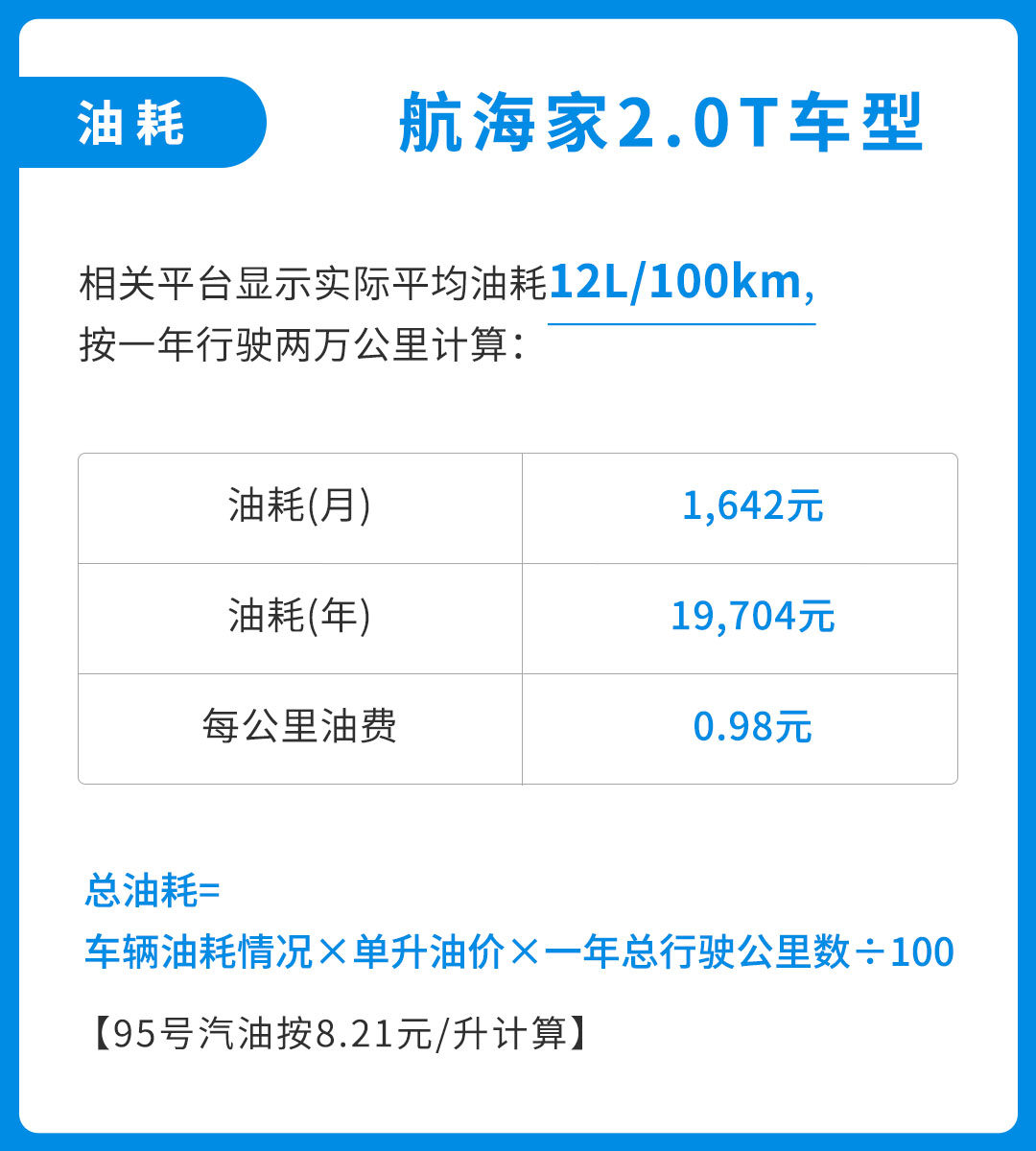 以目前广东地区95号汽油8.21元/升的价格计算,一年行驶2万公里,航海家2.0T 四驱尊雅版的油费为19,704元,每月平均约1,642元,每公里平均约0.98元。