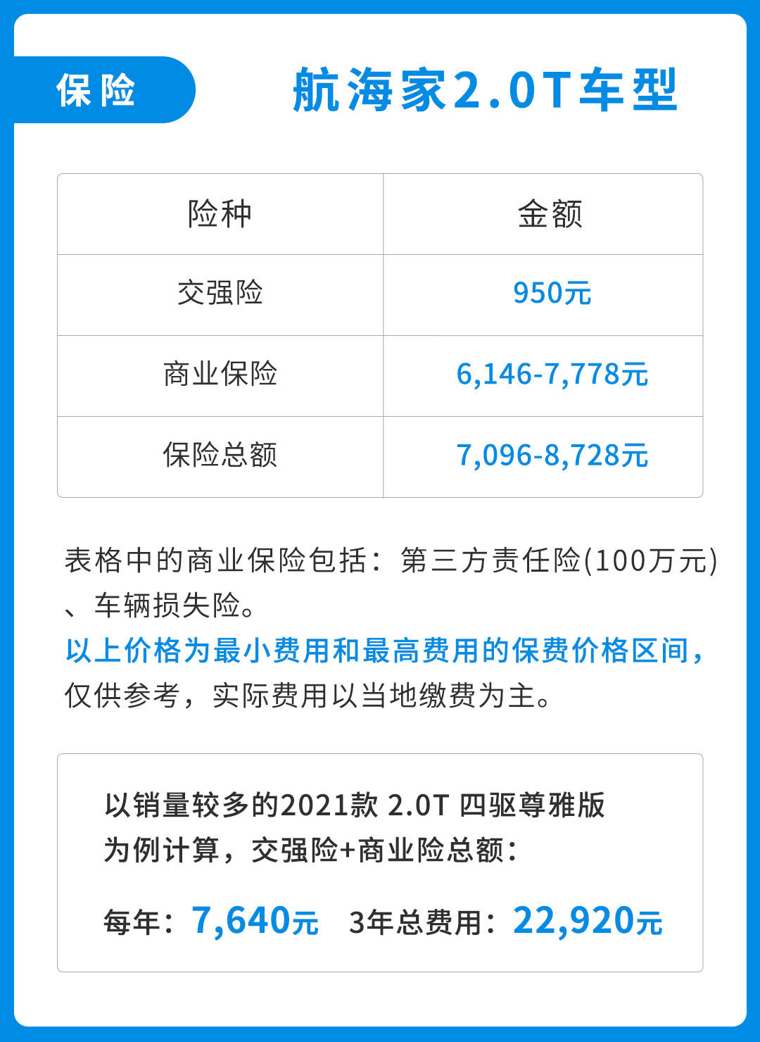以畅销的航海家2.0T 四驱尊雅版为例,一年的保险费用为7,640元。