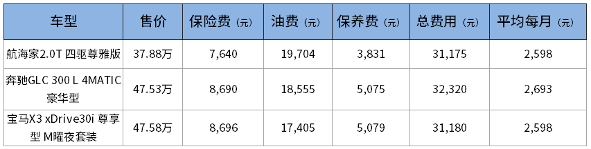 每月2,598元的固定养车费用,相比普通合资品牌SUV(一般1500元/月)确实偏贵。但与奔驰GLC、宝马X3等同级豪华SUV相比,在配置相近的情况下,航海家的养车成本更低一些,但三者的差距不会太大。