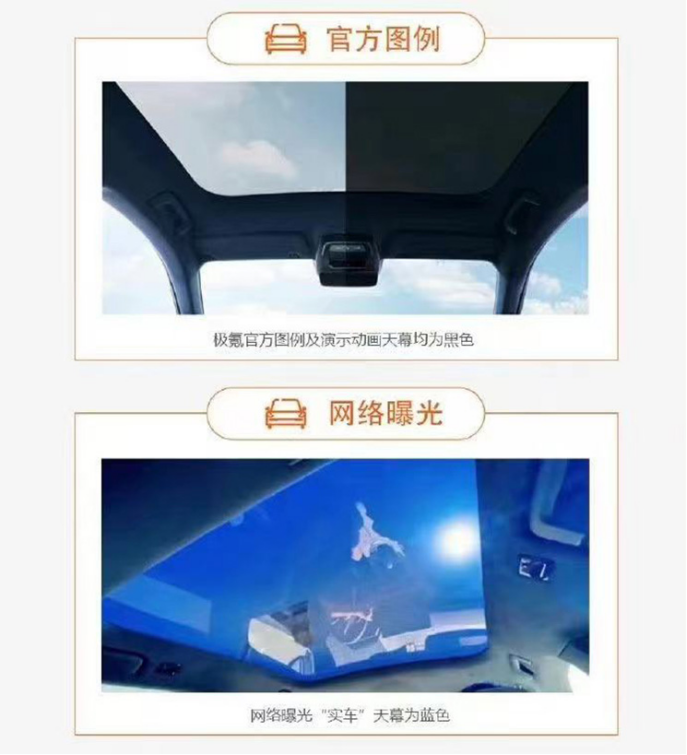 很明显能看出,官方展示的天幕为黑灰色,网络曝光图片则是蓝色。