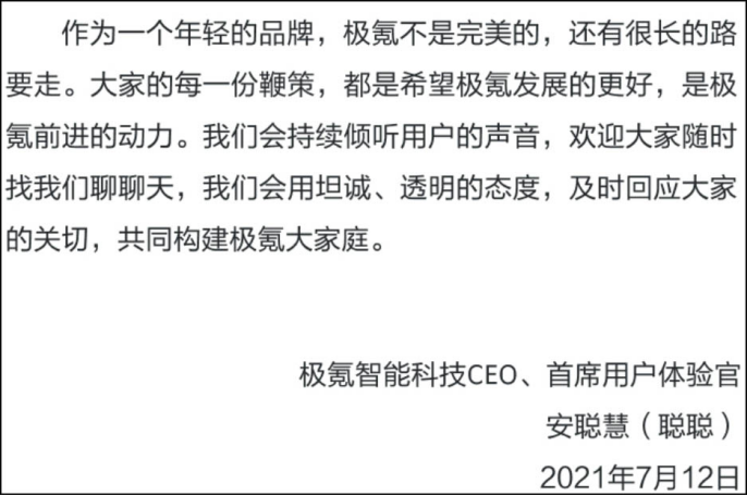 今年7月份极氪CEO在一份回应中就表示:作为一个年轻品牌,极氪不是完美的,大家每一份鞭策,都是希望极氪发展的更好,是极氪前进的动力,我们会持续倾听用户的声音,我们会用坦诚、透明的态度,及时回应大家的关切,共同构建极氪大家庭。