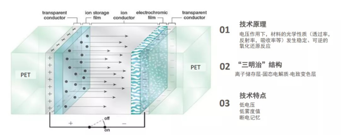 EC光致变色调光玻璃,原理是通过让玻璃内的特殊材料产生化学反应,使得玻璃中的电解质可以在透明和非透明两种状态之间切换。