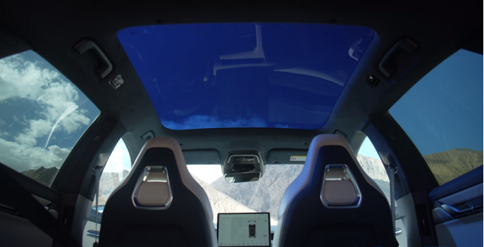整个调节的演示的过程长达01:43,这也算是EC光感天幕的其一缺点吧,毕竟状态切换时间并不快。而上图则截取于00:52,接近总时长的一半,此时能看到天幕已经逐渐变为蓝色,和左后车窗可视环境开始出现明显区别。