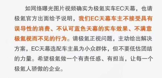 但声明里“希望极氪官方重视用户呼声,及时回应车主的关切,请极氪正视问题,主动给出解决方案”等字眼,就足以说明了极氪官方当时对此事件的态度,以及车主们的无奈...