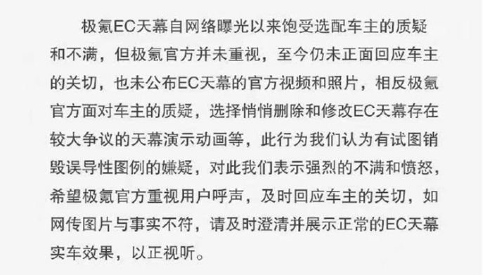 并且这份声明表示,在车主们发起质疑和不满以后,官方并没有作出回应,相反,而是悄悄删除和修改存在较大争议的天幕演示动画,于是这更加引起了车主们的强烈不满与愤怒,同时车主希望官方能及时澄清。