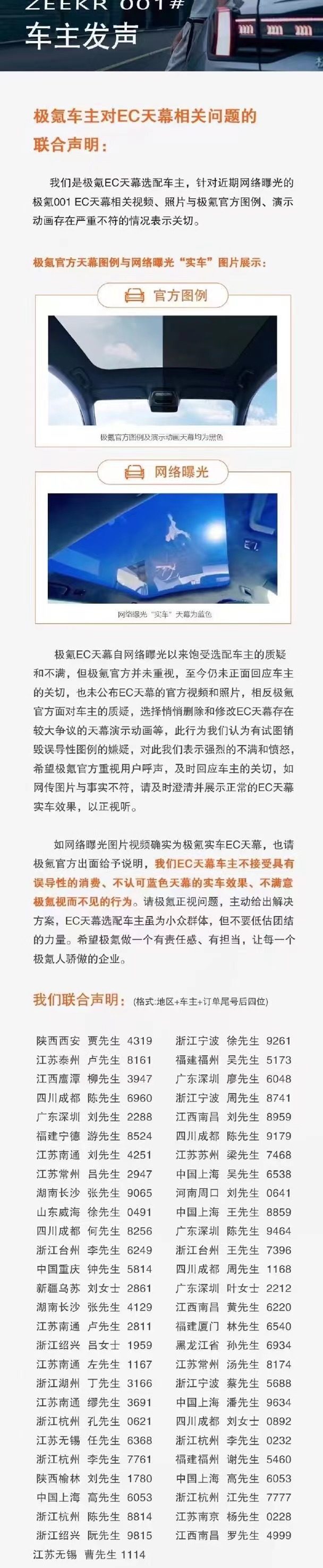 这份极氪车主《联合声明》里,发声车主都是选配了EC天幕的车主,车主们甚至把自己的姓氏和订单号尾数都摆出来了,而其中最大争议点就在于:极氪官方所展示的EC天幕图例与网络曝光的图片存在颜色差异。