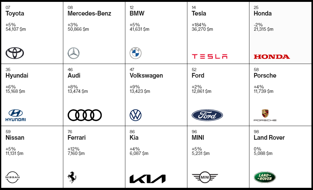 在此次公布的榜单之中,前三名依次为苹果、亚马逊和微软,保持了去年一样的排名,当然这并不是我们关心的地方。回到汽车行业这边,此次共有15个汽车品牌进入榜单前100强,其中丰田和梅赛德斯-奔驰进入了前十,前者排名第七,品牌价值为541亿美元,比上年增长了5%;后者品牌价值以508亿美元排名第8。而宝马以416亿美元排名第12,相比去年还下降了一位。