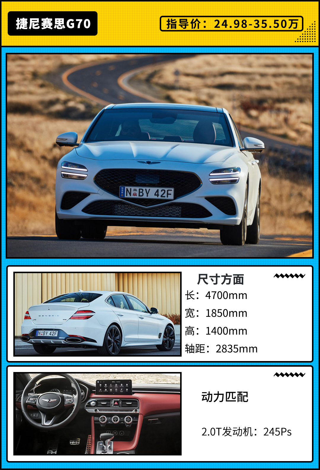 动力方面,捷尼赛思G70全系搭载2.0T涡轮增压发动机,最大功率为245Ps,峰值扭矩353N·m;与其匹配的是一款8速手自一体变速箱。