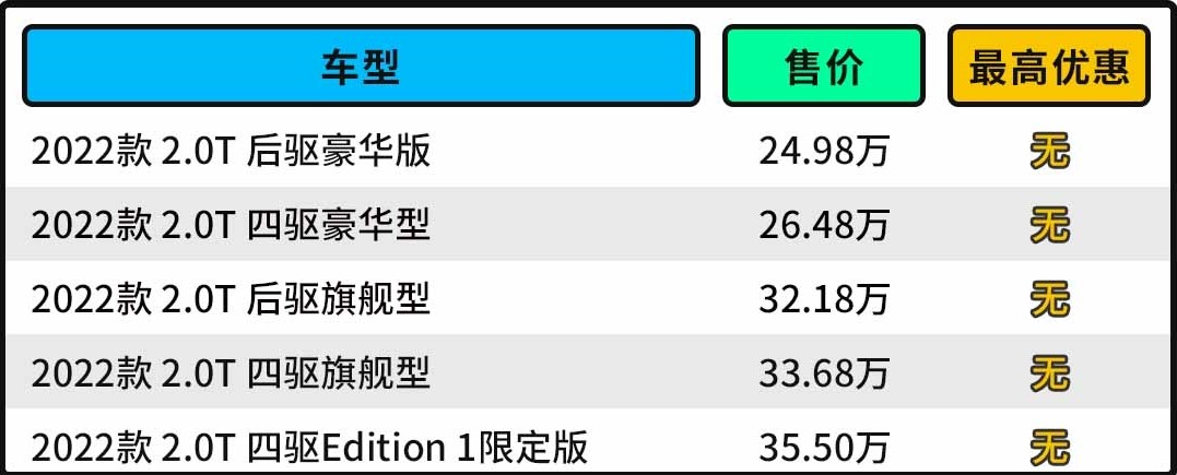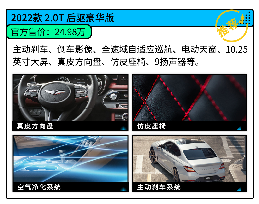 2022款 2.0T 后驱豪华版作为入门版车型,其售价低至24.98万元,但是把主动刹车、前后驻车雷达、倒车影像、全速域自适应巡航、电动天窗、胎压报警、10.25英寸大屏、真皮方向盘、仿皮座椅、9扬声器等配置,入门版车型就给你高配车的体验,所以买买君非常推荐。