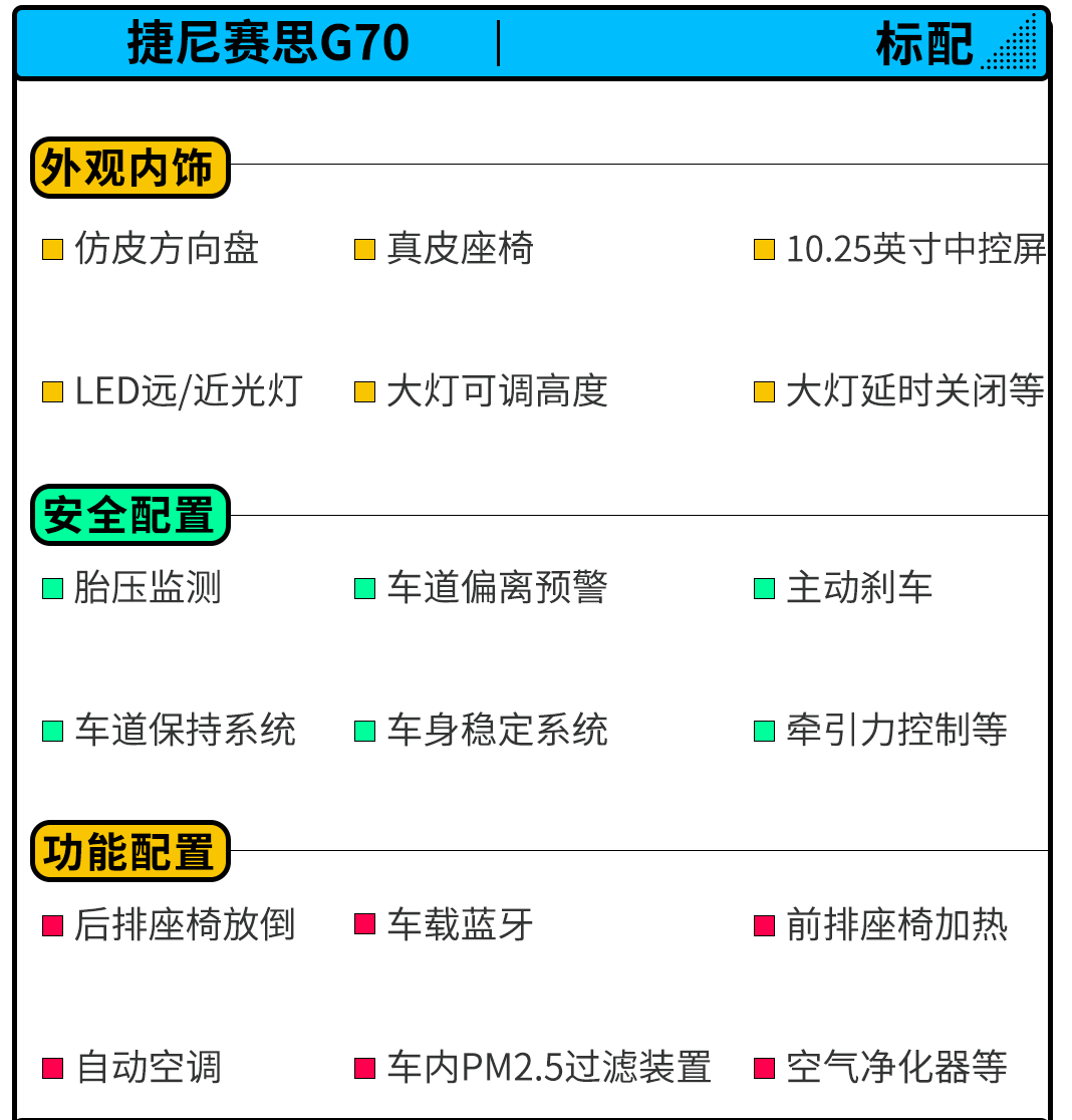 10月29日,捷尼赛思G70正式上市,新车共推出5款车型,全系标配2.0T+8AT的动力总成,售价区间为24.98-35.50万元。