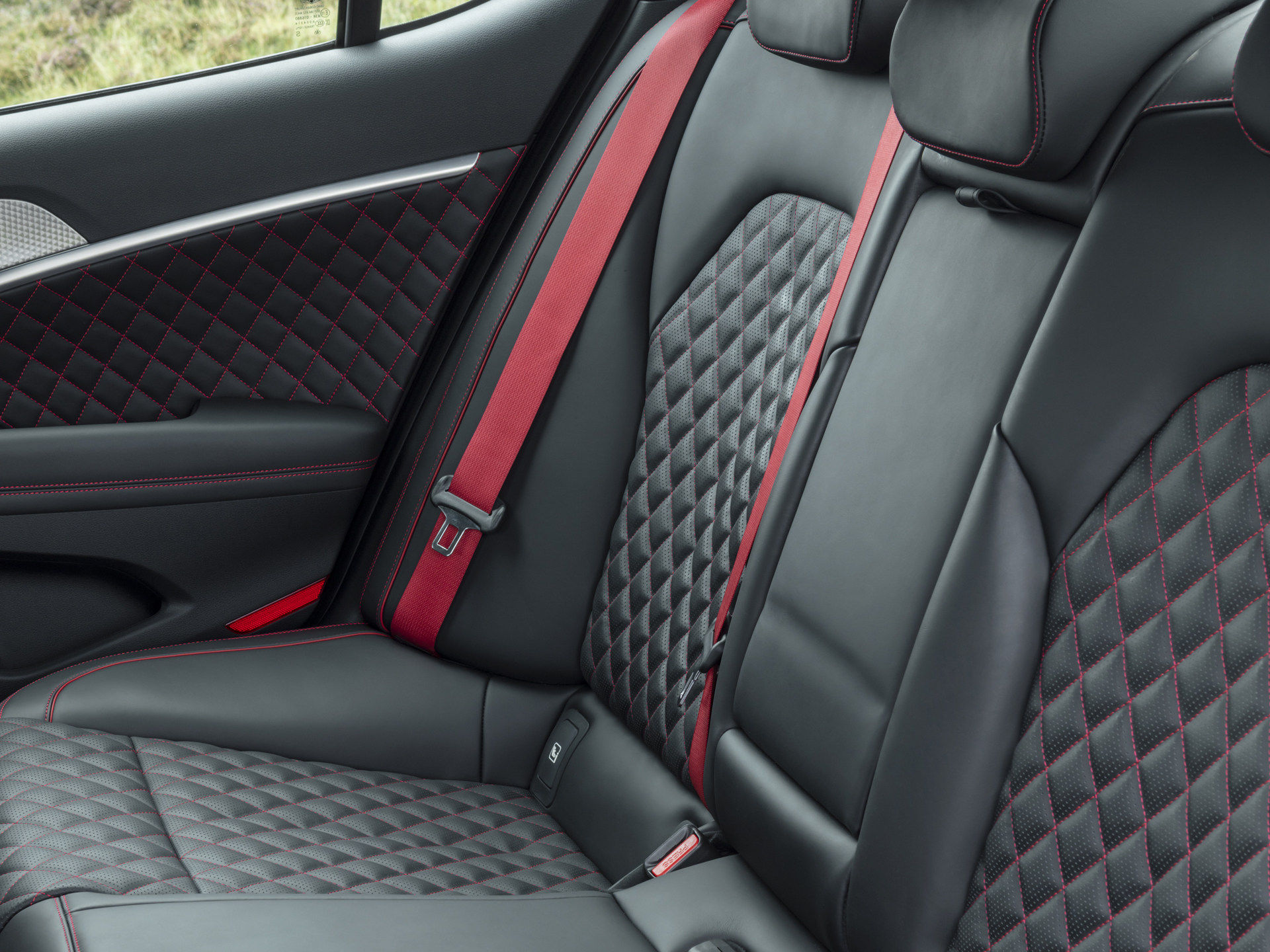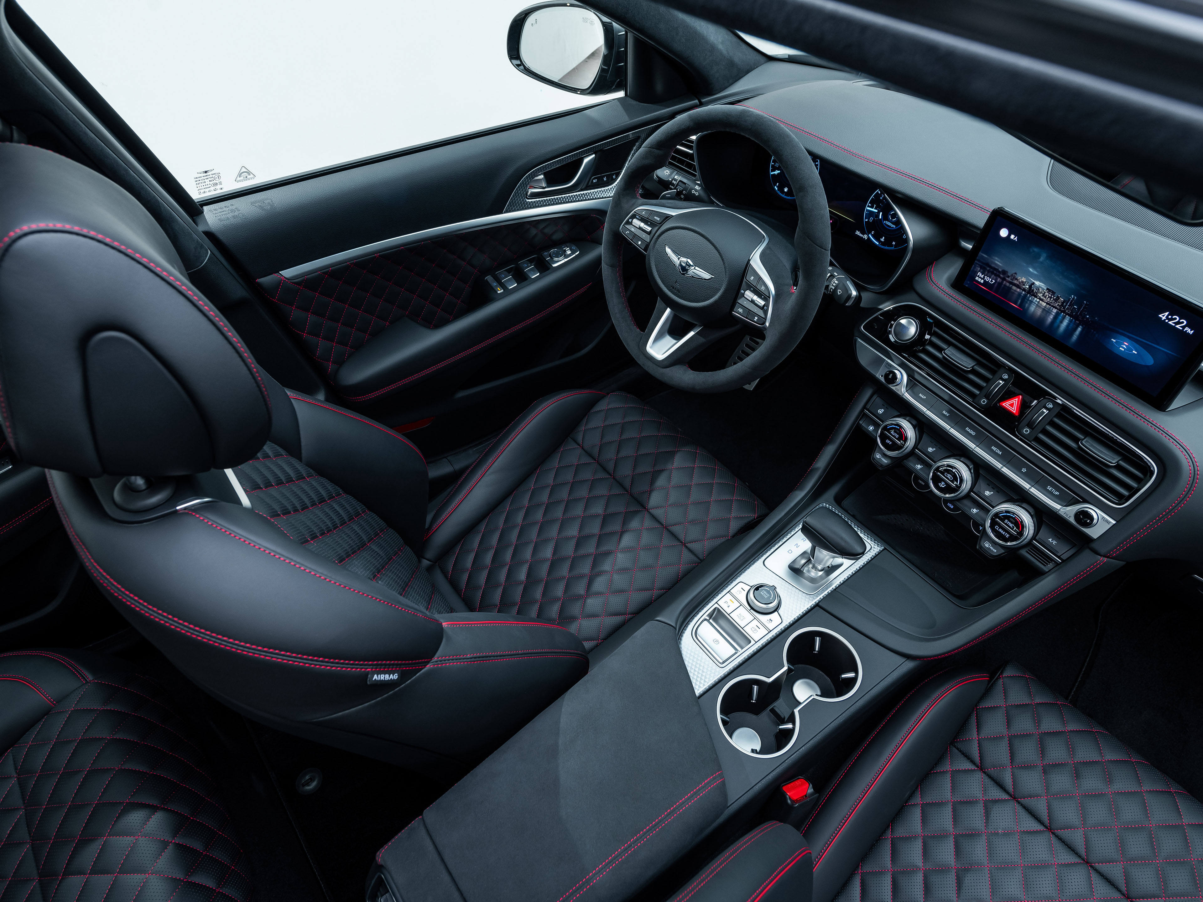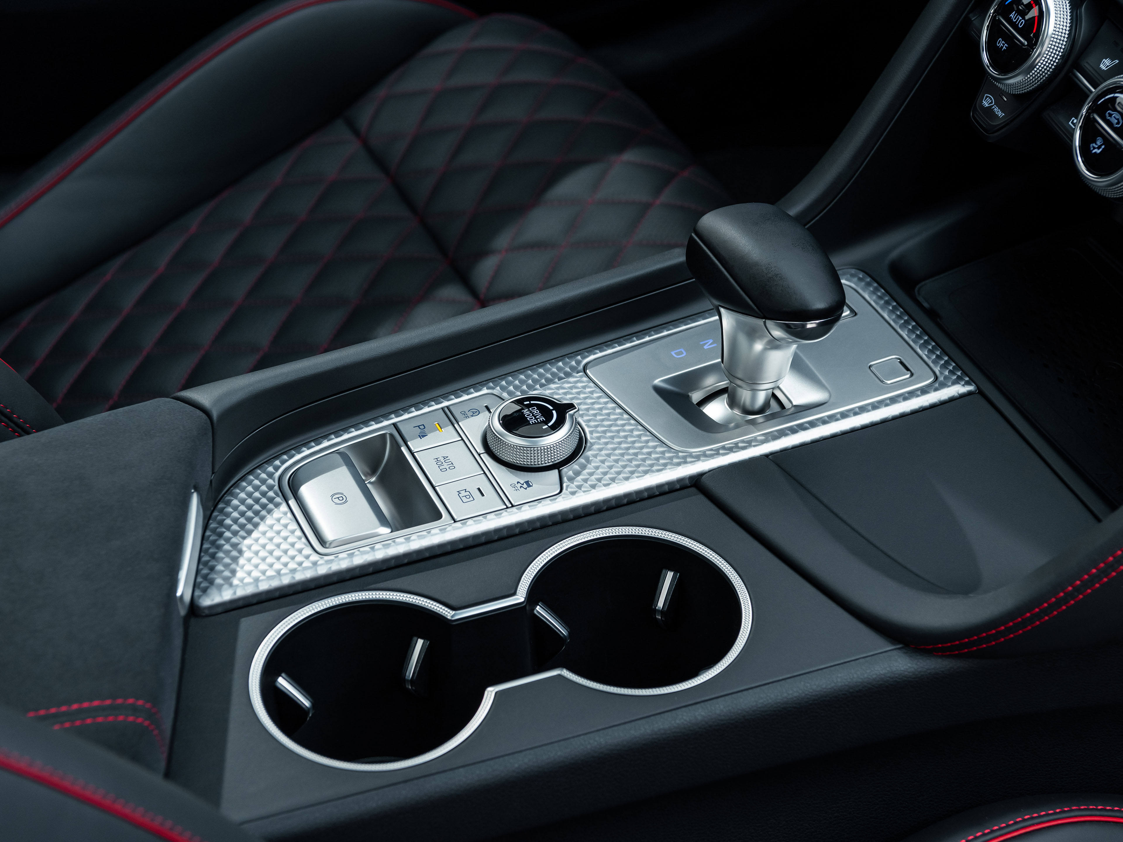 坐进捷尼赛思G70的车内,可以发现其中控台设计较为简洁,营造出浓厚的居家氛围。车门内侧采用大面积菱形皮革进行包裹,而座椅则采用真皮打孔+红色缝线点缀,展现出该车独特的豪华气息。