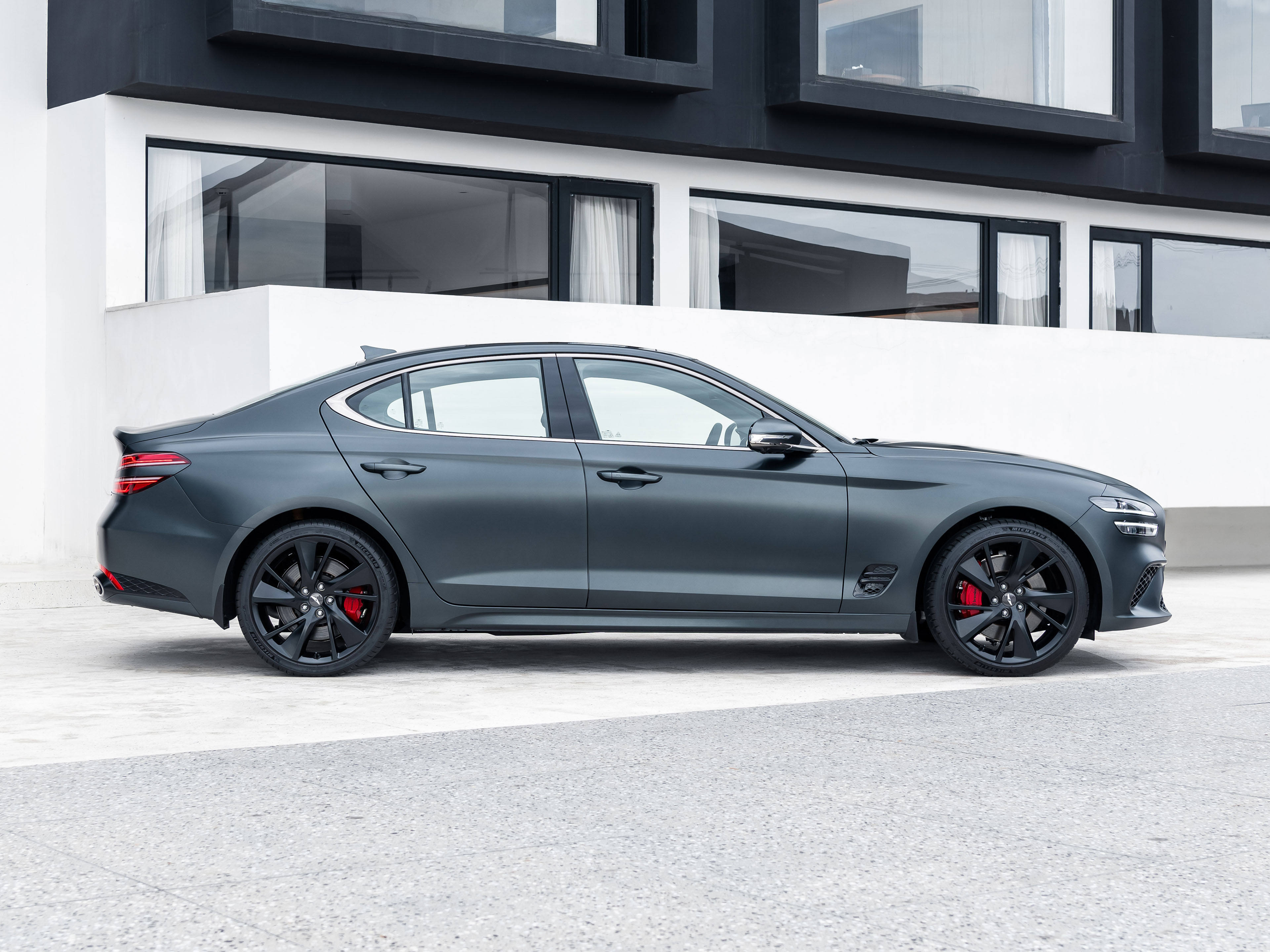 车身侧面,可以看得出捷尼赛思G70符合当代年轻消费群体的审美观念,在车侧前翼子板出配有导流通风口,“浩漾之雅”车身流线则为极具肌肉感的车身设计增添运动感,即便在车辆静止时也散发出浓厚的运动气息。