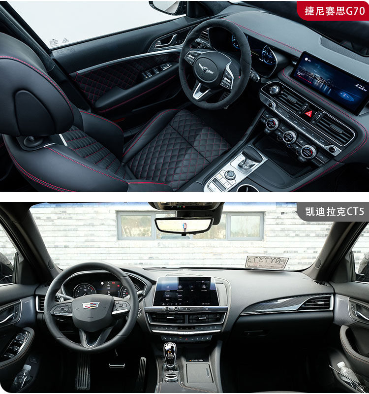 内饰方面,对于豪华感氛围而言,两者均只能说中规中矩。捷尼赛思G70可以看出上一代产品的设计影子,放在当下有些略显平庸,但细节处理还是有加分,大面积使用菱形皮质以及红色缝线进行包裹,一定程度拉高了档次感。
