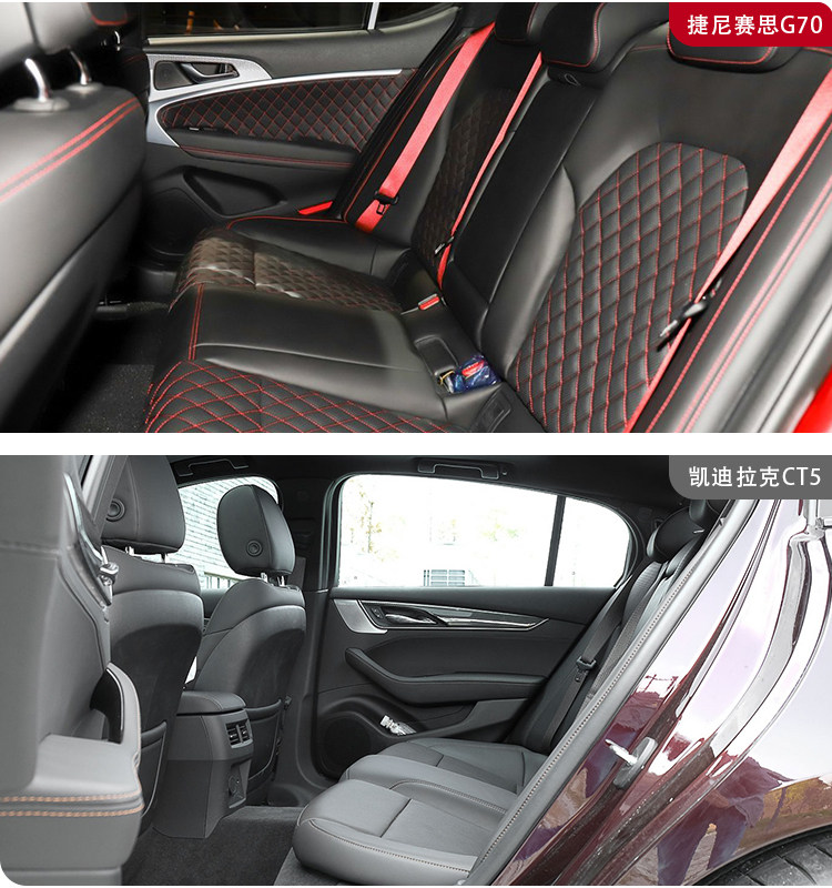 而凯迪拉克CT5虽然尺寸和轴距都要捷尼赛思G70大上一圈,但由于美系的特性,为后备厢腾出了较大的储物空间,导致于后排空间并不太理想,在乘坐上只能说仅仅够用,如果只应对一些小长途的出行,没太大什么问题,但较长时间乘坐舒适度会有所下降。