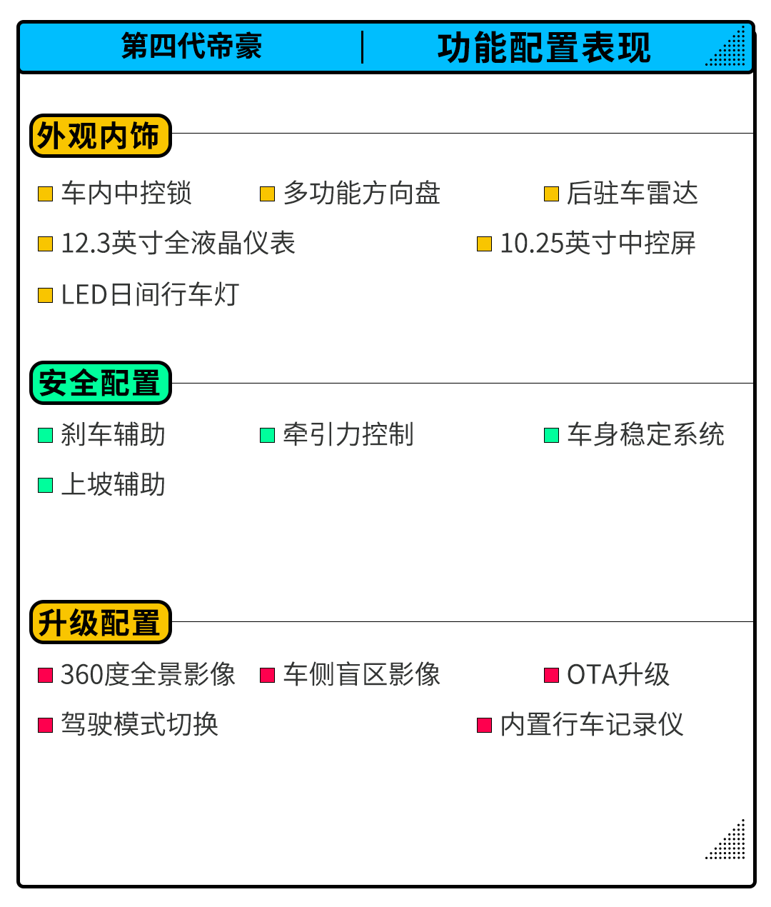 虽说第四代帝豪的起步定价贵上了7100元,但如果细细了解过其配置表现之后,才发现第四代帝豪权衡定价和配置水准依然能够值回票价。除了配置功能所体现的驾乘档次感升级之外,安全配置的升级提升了第四代帝豪购买力层面的性价比。