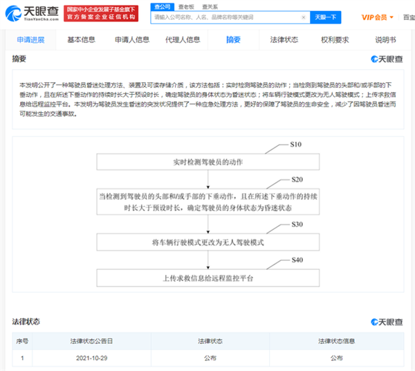 据信息显示,该项专利可以实时检测驾驶员的动作,当检测到驾驶员的头部和/或手部的下垂动作,且持续时长大于系统原有设定时长,就会自动介入将车辆行驶模式更改为无人驾驶模式,并上传求救信息给远程监控平台。