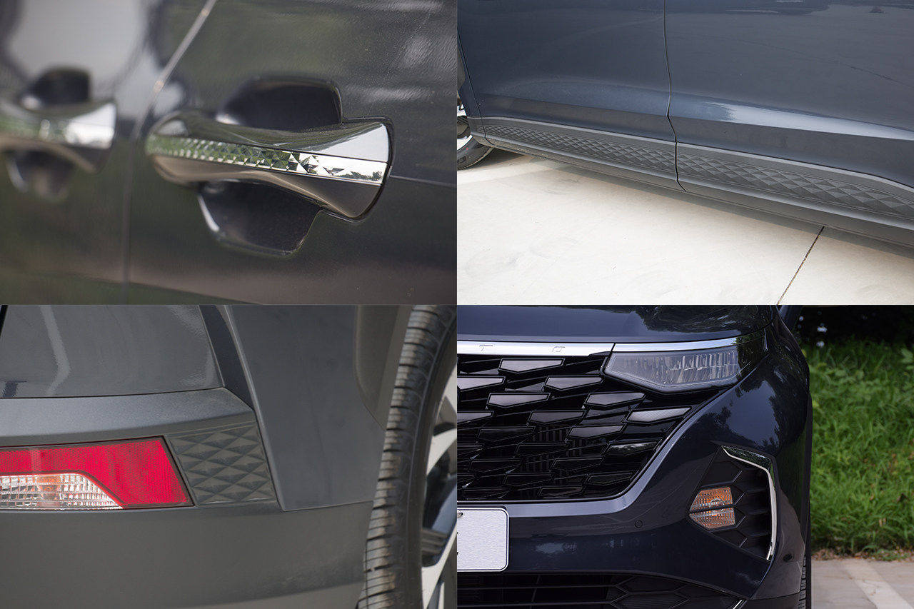 而在细节处也有较讨巧的地方,例如在门把手、侧裙、后包围等,都加入了凌形格纹路点缀,或许是想拨高档次感,但如果遇到一些泥泞路段更容易附着灰尘泥水在上面。