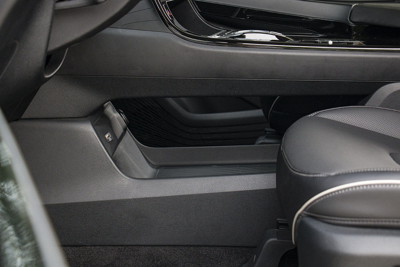 另外,比较惊喜的是,在中控下方还镂空出了巨大的储物槽,可以收纳很多常用的杂物,重点是开口也非常之大,取放东西相当方便。