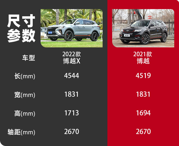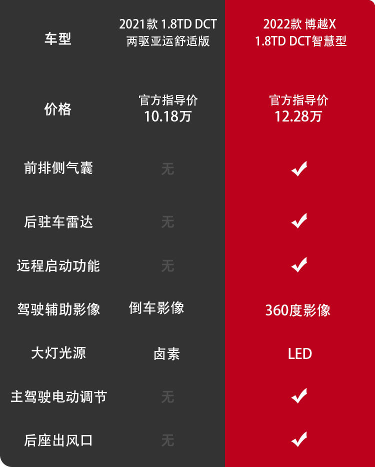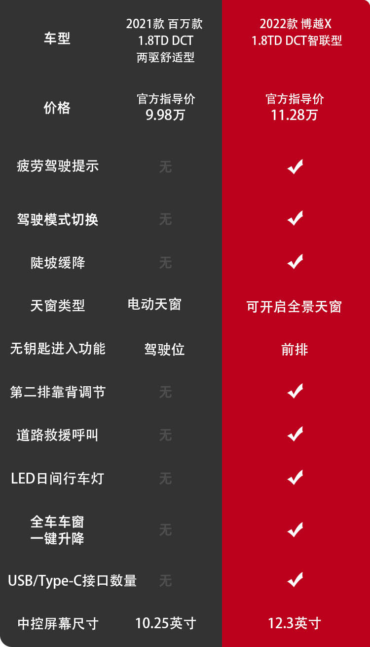 2021款 百万款 1.8TD DCT两驱舒适型(9.98万)和2022款 博越X 1.8TD DCT智联型(11.28万)在售价上可以看出来两者相差1.3万元,配置上的差异主要体现在实用、舒适性功能。