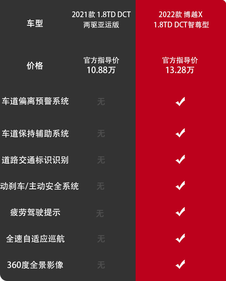2021款 1.8TD DCT两驱亚运版(10.88万)和2022款 博越X 1.8TD DCT智尊型(13.28万),到了中高配车型,最主要的差异在于安全辅助功能上。