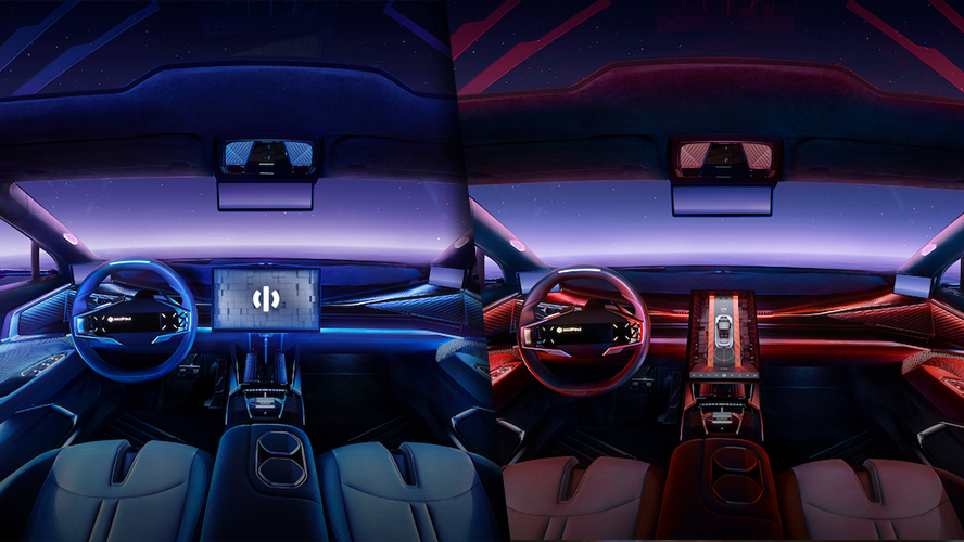 进入内饰,依旧延续游戏室般的内饰设计。车厢内部布满发光面板,能够根据氛围灯的每一次有韵律的“呼吸“,调动着车内的乘员的情绪,营造出强烈的科技氛围,多面环绕的发光面板环抱感十分强烈,让人车内乘员能够获得沉浸式的驾乘体验。