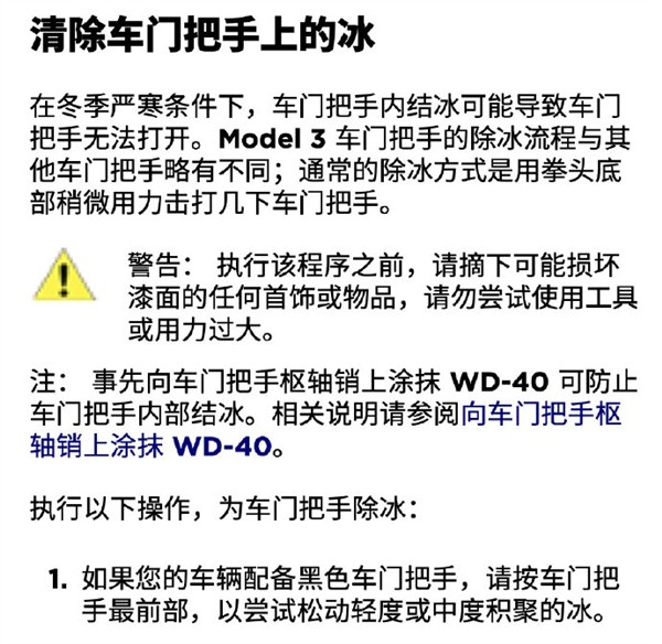 不过在官方的用车手册中,其实也有提到如何给车辆的门把手破冰,但教授认为,尽管提供了解决的方法,隐藏式门把手依旧给车主冬季用车时带来了不便。