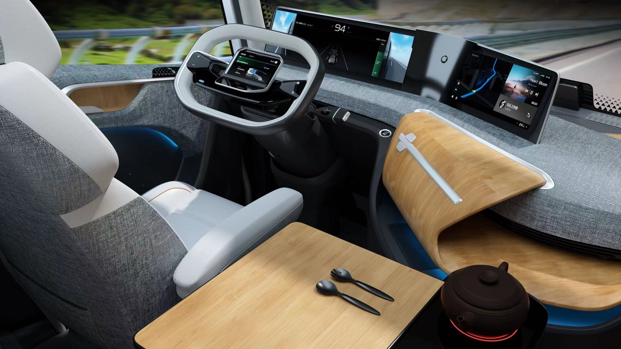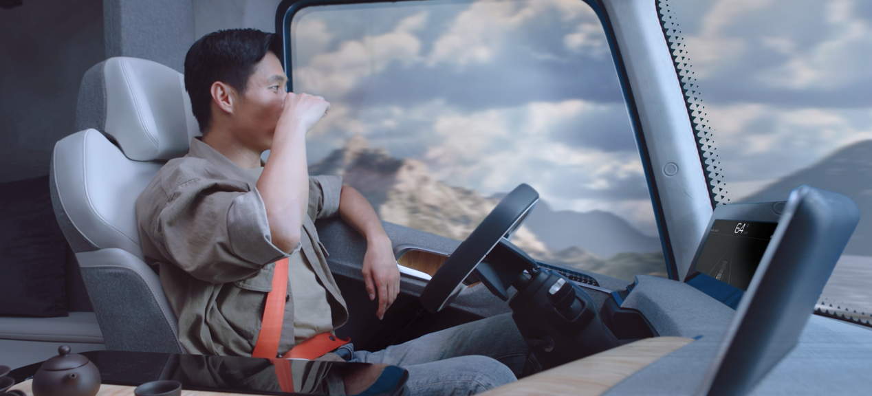 符合人体工学的座椅设计和高清摄像头+独立显示屏的方案,可以帮助司机在长途驾驶时获得充分的休息和脊柱保护,消除视野盲区。同时配合强大的AI实时交互,让司机与车辆无缝沟通,像生活助理一样,在衣食宿沐和健康问题上给予贴心关怀和及时提醒。
