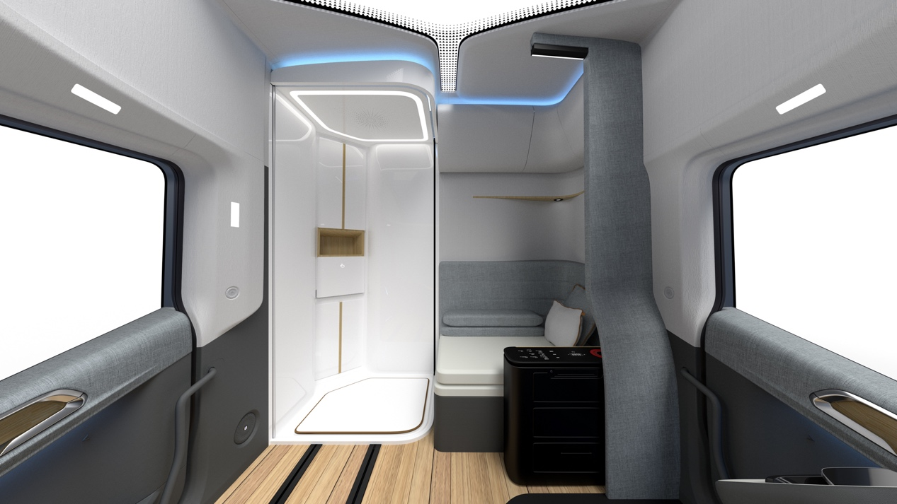 因此整个座舱设计围绕司机的核心痛点,应用家的理念,合理优化驾驶区和生活区,经过严谨的逻辑工效学和空间结构学研究,设计了包括淋浴房、洗手间、超级单人床、冰箱、煮茶器等,让座舱空间得以充分利用,一切物品触手可及。在车门下方还外置了厨房和洗烘一体洗衣机,将家的烟火气巧妙搬到车上。
