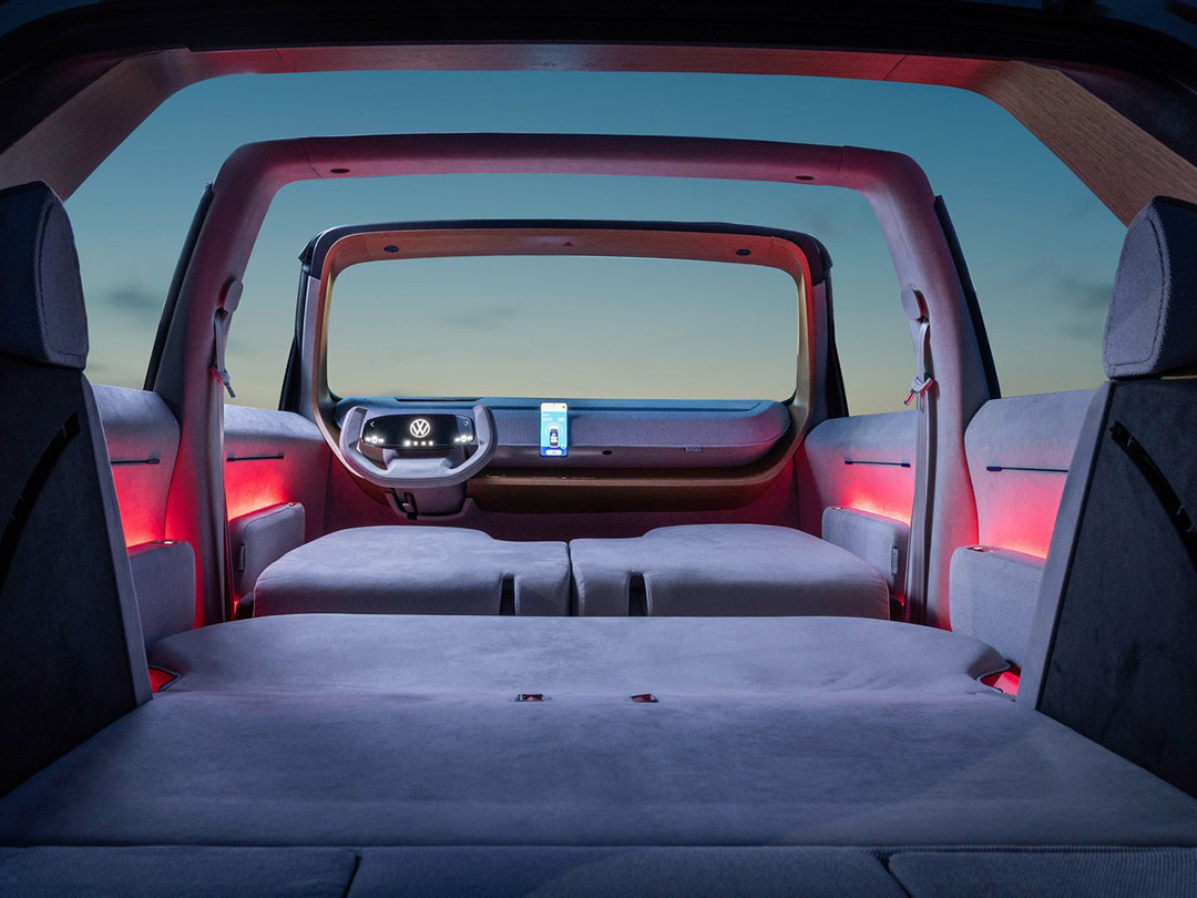 此外,设计师将ID.LIFE的前排座椅设计成可放平的形式,乘客可以在后排乘坐,将前排座位腿托使用,配合上34英寸的大尺寸投影屏幕,可以随时随地享受影院的乐趣。而当所有座椅折叠之后,内部拥有1285L的空间,只要铺上一层充气垫,就可以实现车内露营的乐趣。