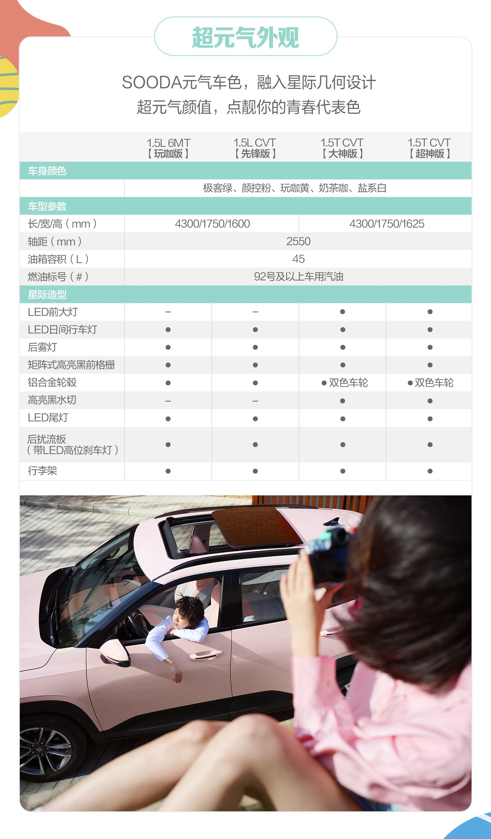作为专为Z世代元气青年打造的一款车,RS-3 SOODA拥有长宽高4300*1750*1600(1625)mm的SUV车身尺寸,内外造型设计更具青春活力。车身及内饰色彩交相辉映,多款焕新元气车色,融合“星际几何美学”设计,使得整车造型更富个性时尚美感;RS-3 SOODA内饰布局灵活,打造“超元气座舱”,并以同级罕见电动全景天窗、一体式运动座椅等实用丰富配置,带给用户实实在在的便捷舒适驾乘体验。