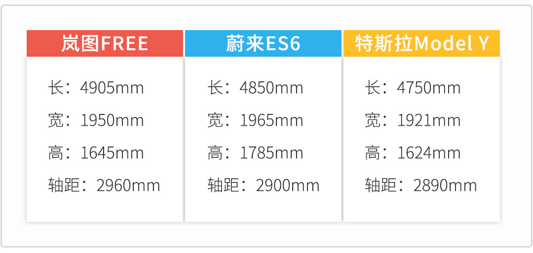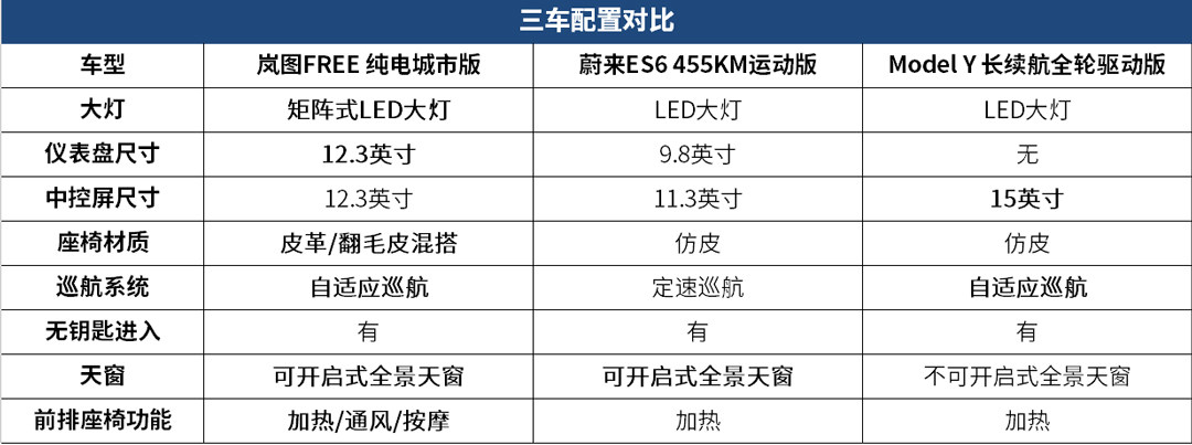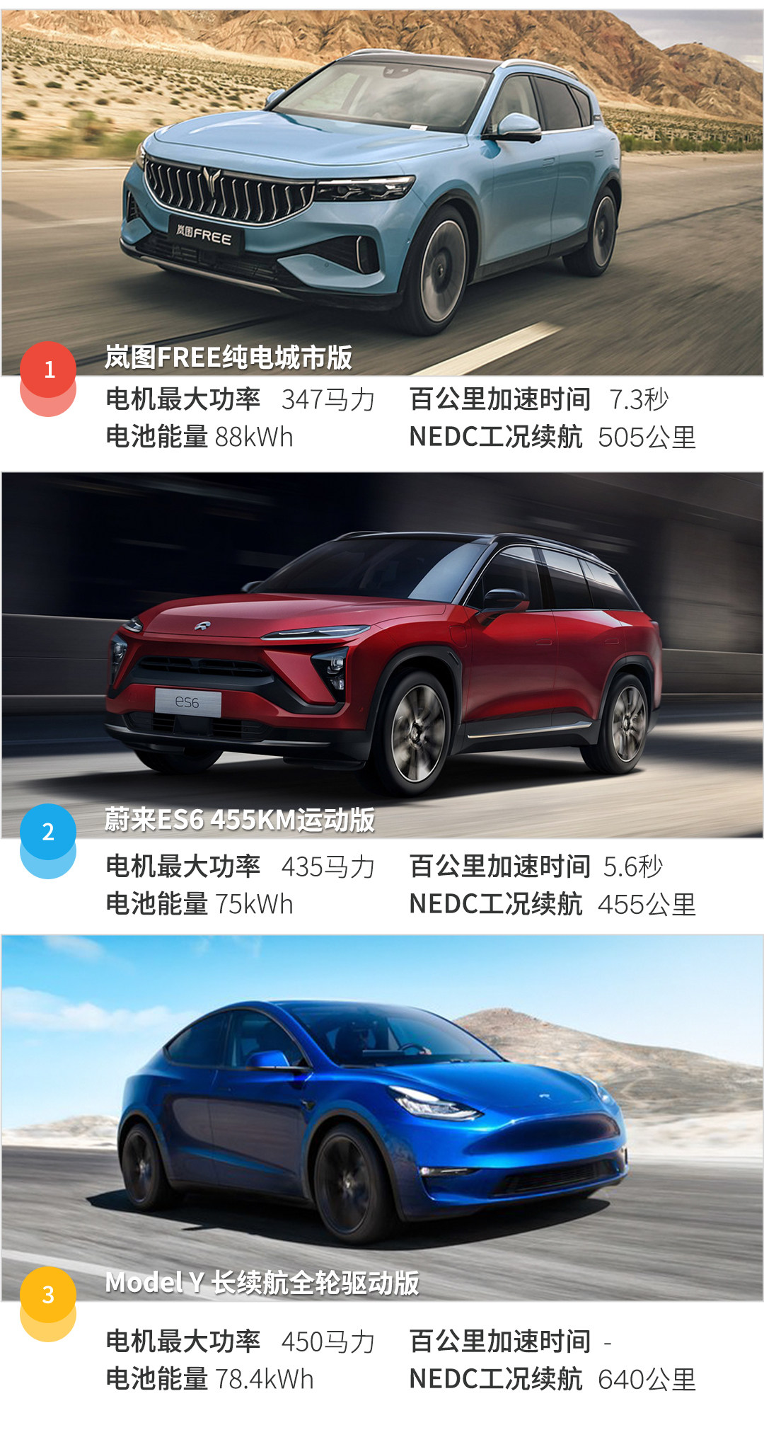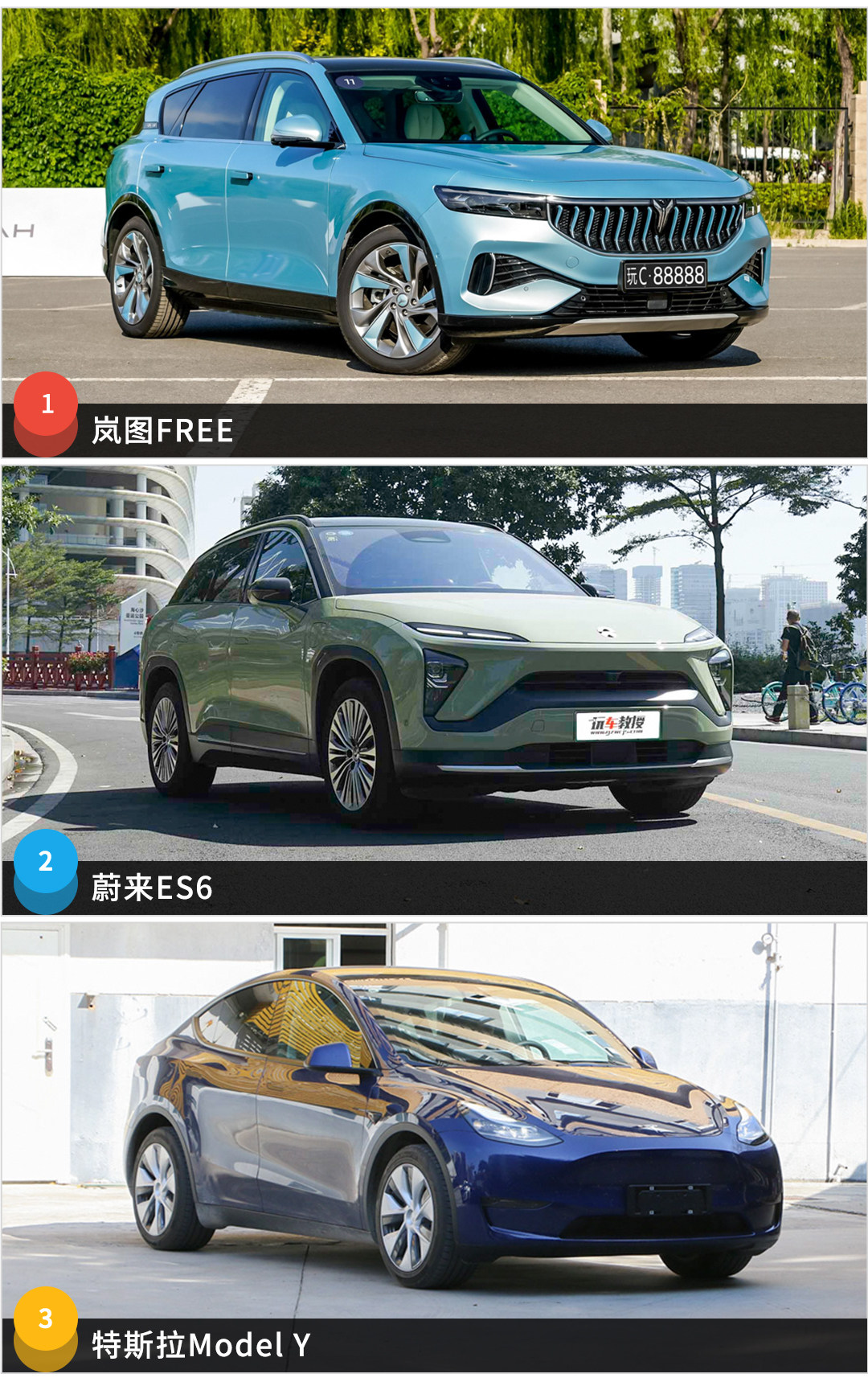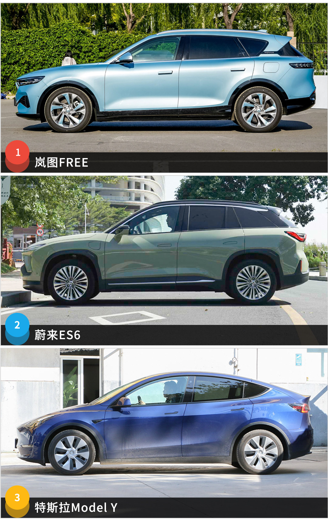 通过以上对比可以看出,三款车对于各自的定位都有着清晰的规划,其中岚图FREE很在空间尺寸、功能配置等方面有着不错的优势,比较适合家庭用户。而动力参数凸出的特斯拉Model Y则更适合对于驾驶体验有极致追求的年轻用户。至于蔚来ES6?由于它的各方面都没有明显的优势,除非是选购它更高配的版本,不然同价位范围内实在没有太多的理由去选择它。