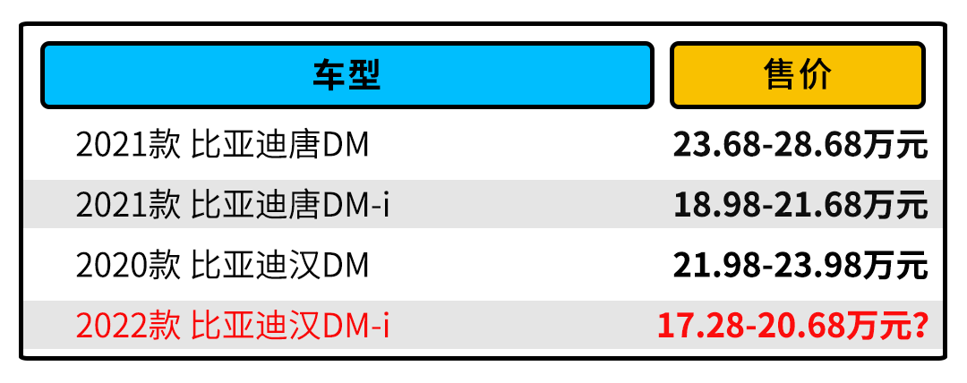 关于价格方面,现款比亚迪汉DM车型售价区间为21.98-23.98万元,作为参考,现款比亚迪唐DM车型售价区间为23.68-28.68万元,而唐MD-i车型售价区间为18.98-21.98万元,起售价相对便宜了4.7万元。如果以此类推,汉DM-i车型起售价或为17.28万元,这个售价你们觉得合不合理?