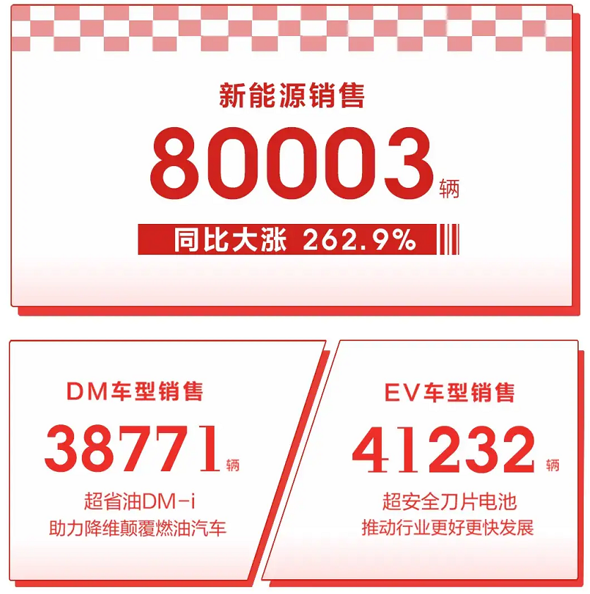 更值得注意的是,在比亚迪的乘用车销量中,新能源汽车的占比已经超高了90%,共销售出80,003辆新车,同比增长幅度高达262.9%,这一切离不开超省油的DM-i技术以及超安全的刀片电池,它们共同缔造了比亚迪传奇神话。