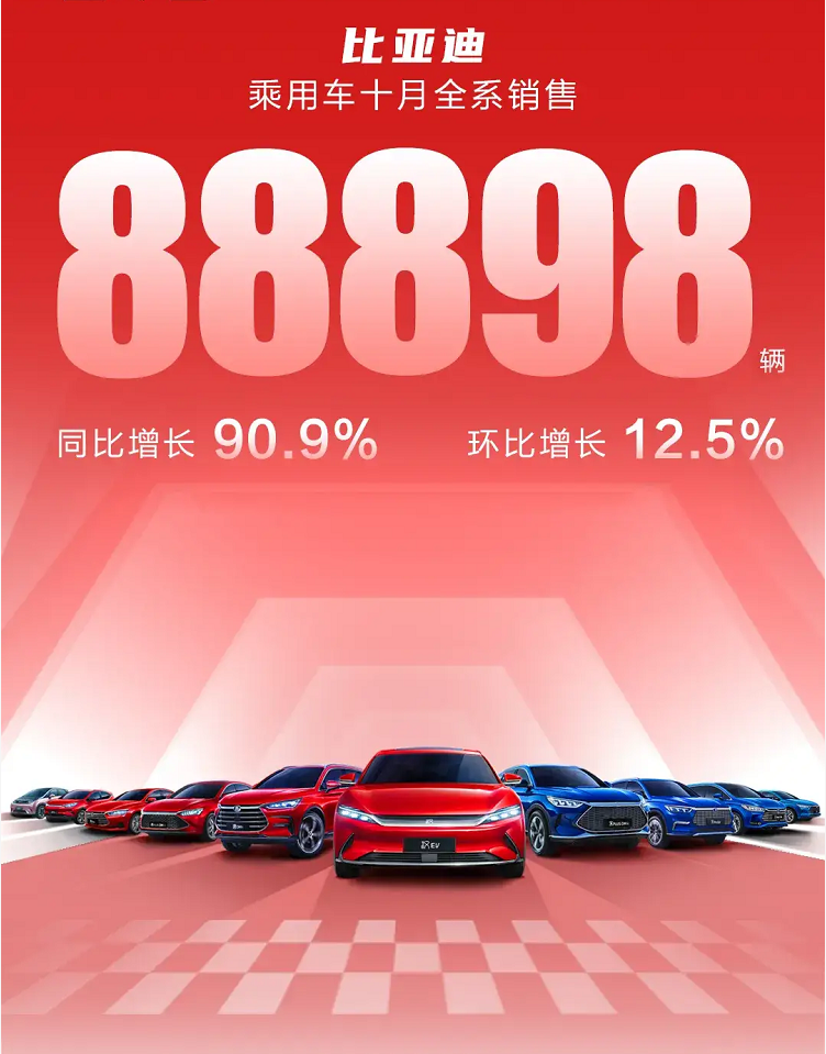 11月份刚到来不久,比亚迪在10月份又交出了一份满意的销量答案,根据比亚迪公告显示,今年10月份比亚迪整体销量达到89,935辆,其中乘用车销量达到88,898辆,同比增长90.9%,环比增长12.5%。