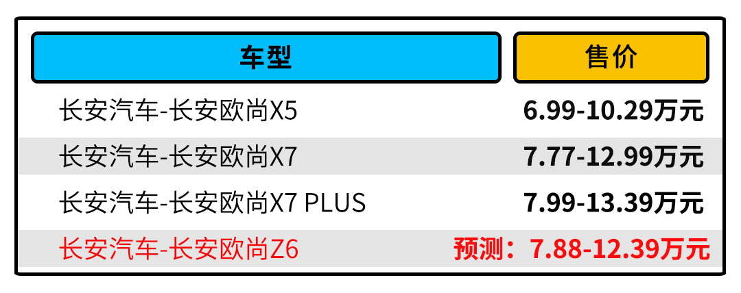 纵观欧尚汽车,没有一款燃油车起售价超高10万元,相对走量的欧尚X5、欧尚X7系列起售价还不到8万元,这也使得欧尚汽车有着绝对的价格优势。所以如果存在手动挡车型的话,欧尚Z6起售价或不会超过8万元,而如果起步就是自动档车型,售价预计在9万元左右,依然是走性价比路线,与长安家族那些车型差异互补、各司其职。当然这只是买买君个人猜测,之前也曾收到小道消息,长安准备对欧尚拔高,Z6也有可能看齐长安UNI-K,售价或将高达15万元。