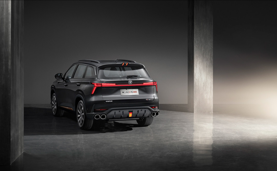 车尾部分,第二代CS75PLUS最明显的莫过于配备了贯穿式的LED尾灯,内部由62+132颗+62颗超红光LED构成,可实现流水式点亮效果,视觉效果上完全可以媲美“灯厂”奥迪。与此同时,底部动感的扩散器加四出排气的设计得到了延续,很符合当下年轻消费者的审美。