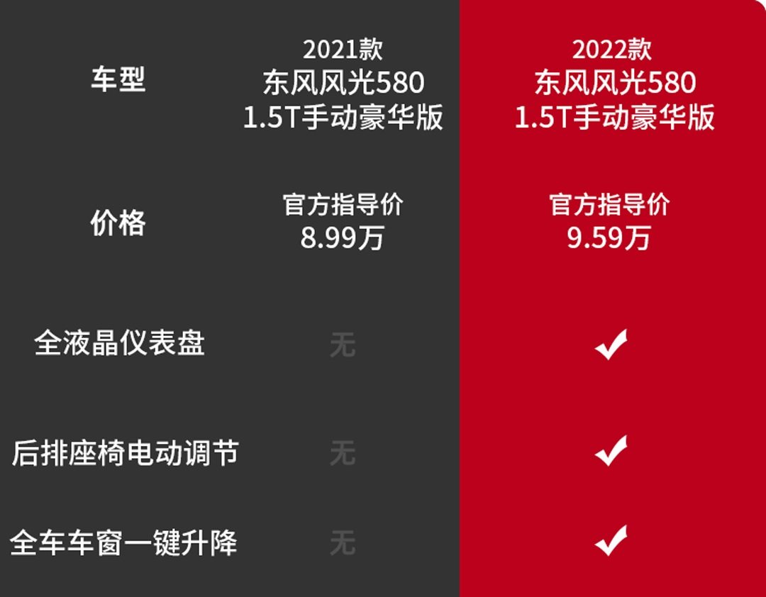 除了外观、内饰、动力这些方面的区别之外,实际上两者的配置方面也有很大的差距,以它们各自的顶配版本为例,2022款风光580多出了电动尾门、车内氛围灯、座椅加热、多项安全辅助功能等,虽然有着1.4万元的差价,但综合下来还是比较划算的。而且多项舒适性配置的增加,也能使得日常用车体验变得更加便捷。