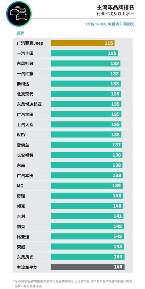 但今年连续好几次上榜且名列前茅,难道在品控方面得到了全面提升,如果真是这样,那广汽菲克Jeep真是太低调了,你们如何看待?同时在主流汽车品牌这份榜单中,东风标致同样引起了买买君的注意,它以平均每百车问题数132个位居第三,不禁让我怀疑这是销量倒数排行榜?