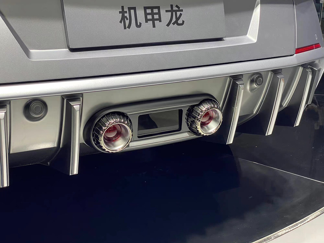 新车全车使用大量碳纤维材料,例如尾翼、前饰条、侧裙、后视镜等,符合机甲龙的定位与设计风格。同时,在轮拱处增加了铆钉的装饰,提升车辆视觉效果,让整体设计更加贴合机甲风。